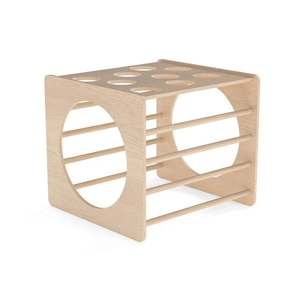 Die stabile Konstruktion aus Kiefernholz verträgt so einiges, sie kann auf allen Seiten stehen, je nach Anwendung oder Vorstellung der Kinder, die vier Seiten mit Löchern oder Sprossen, bringen immer wieder neue Ideen hervor.