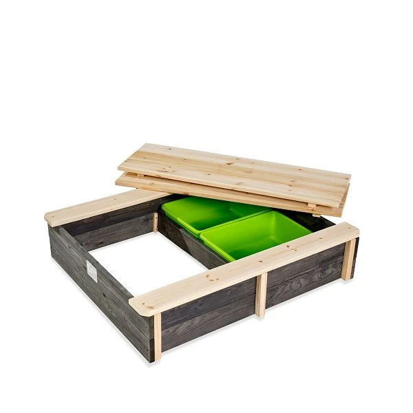 Der EXIT Aksent Holzsandkasten ist ein kompakter quadratischer Sandkasten mit Deckel. Der Sandkasten ist mit zwei grünen Behältern ausgestattet, die Du für den nötigen Wasserspaß im Sommer mit Wasser füllen kannst. Spielt von den Bänken an der Seite aus mit Sand und Wasser und entdeckt, wie Schlamm gemacht wird und erlebt stundenlangen Spielspaß. Die grünen Behälter sind abnehmbar, so dass sie leicht zu entleeren und zu reinigen sind. Bist Du fertig mit spielen? Dann lagerst du das Spielzeug in den Behältern und verschließt den Sandkasten mit der Abdeckung, so dass der Sand und das Spielzeug sauber bleiben.