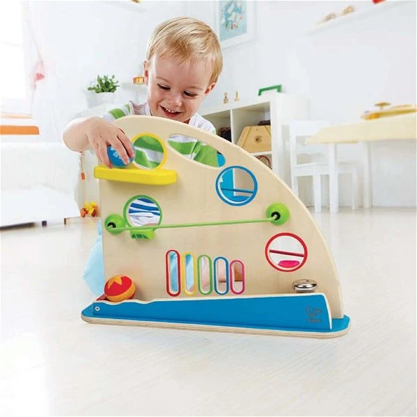 Bunte Holzkugeln, Gefälle, Tunnel und Rollbahnen auf beiden Seiten der Hape Kugelrennbahn – das ist rasanter Spielspaß! Super für die Kleinsten, denn sie können mit den Augen den rollenden Kugeln folgen.