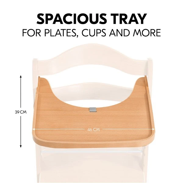 Dank robustem und widerstandsfähigem Material ist das Tablett am Kinderhochstuhl lange nutzbar. Der erhöhte Rand verhindert, dass Spielzeug einfach herunterfällt oder ausgeschüttete Getränke überlaufen. Zum Reinigen wischst du die glatte Oberfläche einfach mit einem Tuch und herkömmlichen Reinigungsmitteln sauber.