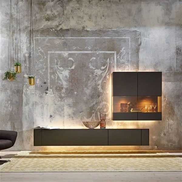 Für diese hülsta Gentis Wohnwand 4 ist die Installation einer indirekten Beleuchtung möglich (siehe Foto). Diese besteht aus einem Funktionsrahmen (Lack weiß) für jedes Element und der entsprechenden LED-Beleuchtung für die Funktionsrahmen. Zusätzlich sind 2 LED-Einbaustrahler für die Hängevitrine enthalten.
