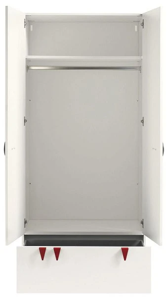 Der Kleiderschrank ist mit 3 Türen ausgestattet. Innen befinden sich links 5 Einlegeböden, rechts 2 Einlegeböden und 1 Kleiderstange.