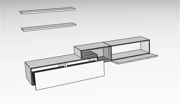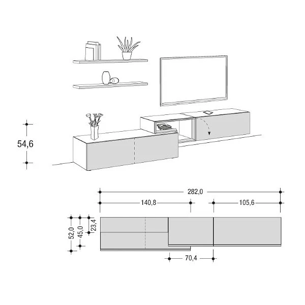 - 1x 2R Lowboard als Hängeelement mit 1 Klappe – Breite: 105,6 cm, Höhe: 35,2 cm, Tiefe: 45 cm (Oberfläche Lack)