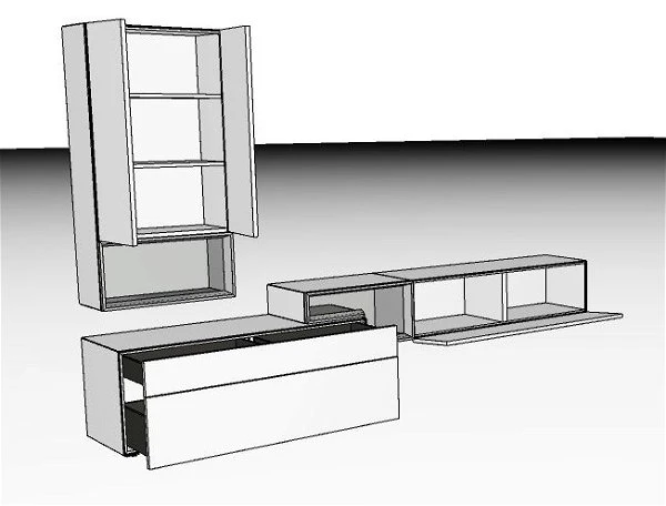 - 1x 2R Lowboard als Hängeelement mit 1 Klappe – Breite: 140,8 cm, Höhe: 35,2 cm, Tiefe: 45 cm (Oberfläche Lack)