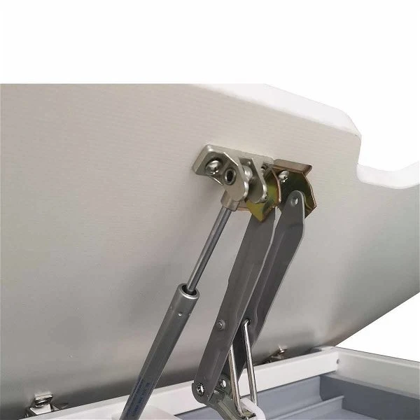 - Tischplattenelement links schrägstellbar mittels Rasterschere mit Dämpfer, Griffaussparung