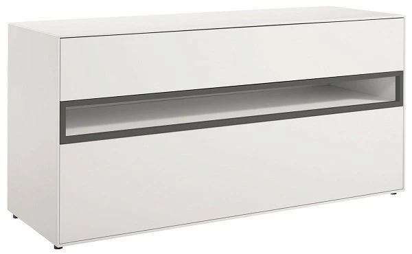 Der now! by hülsta easy Baukasten 4R verfügt über 2 Schubladen und 1 offenes Fach mit genügend Stauraum. Lieferung inkl. 1,5 cm hohen Stellfüßen. Der Rahmen ist in Lack-hellgrau gehalten.