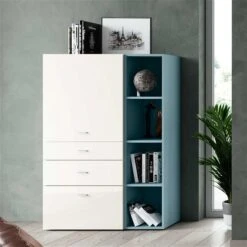 Die now! no.14 by hülsta Kombination 13 in Lack-weiß/Lack-taubenblau/Lack-Hochglanz-weiß verfügt über drei Schubladen, eine Tür und 4 offene Fächer. Die now! no.14 by hülsta Möbel zeigen eine ganz solide Designlinie und zwar sind sie klassisch, zeitlos und hochglänzend. Ein Teil Glas, ein Teil Lack, ein Teil Holz. Dezente Töne und dabei schnörkellos, aber dennoch spielfreudig.