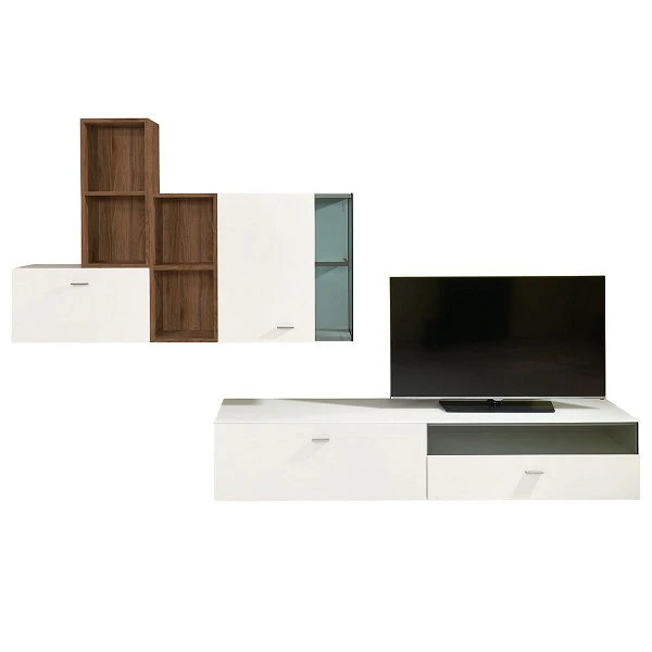 Der Korpus ist in Kernnussbaum und Lack-weiß gehalten. Die Fronten sind in Lack-Hochglanz-weiß.
