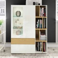 now! vision by hülsta Kombination 7 140x105x42 Lack-weiß/Natureiche/Lack-Hochglanz-weiß