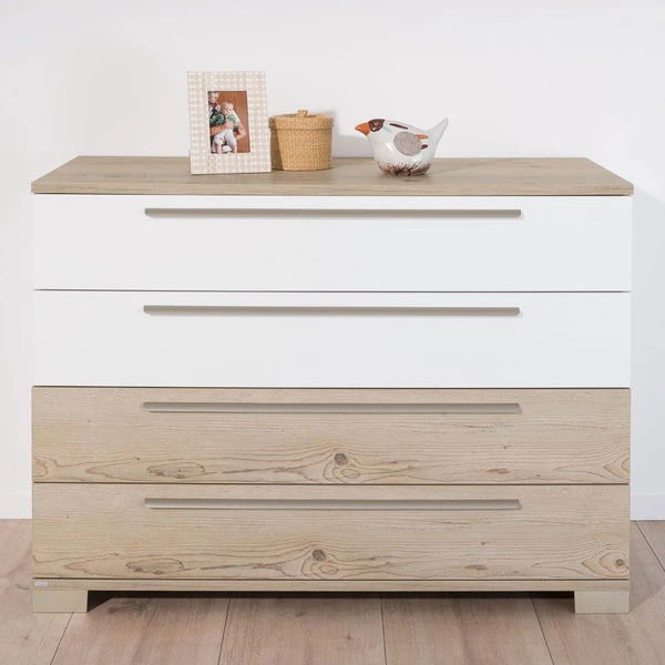 Die Paidi Kommode ist mit 4 Schubkästen (mit Facheinteilung) in kreideweiß ausgestattet. Es können wahlweise eine oder zwei Schubkastenfronten in Fichte-Vintage-Nachbildung geliefert werden. Der obere Schubkasten ist immer kreideweiß und hat einen Vollauszug. Der im Preis enthaltene Wickelaufsatz bietet eine Wickelfläche von 84,2 x 76,5 cm. In die Schubkästen kann ein Schubkasten-Einsatz eingesetzt werden, dieser wird weiter unten als Variante angeboten.