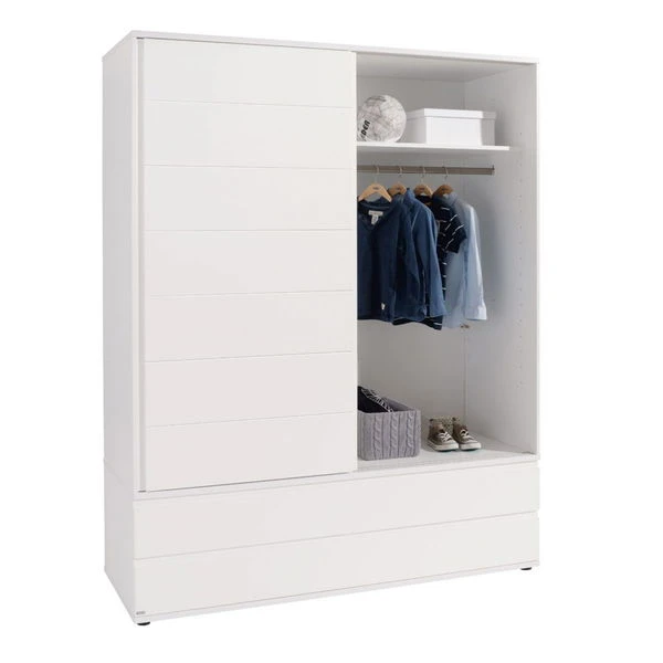 Der Paidi Fiona Schiebetürenschrank besitzt 2 breite Schiebetüren und 2 Schubkästen. Innen ist der Schrank durch 2 Mittelwände geteilt und bietet links und in der Mitte jeweils 3 schmale Einlegeböden und rechts 1 breiten Einlegeboden und 2 Kleiderstangen.