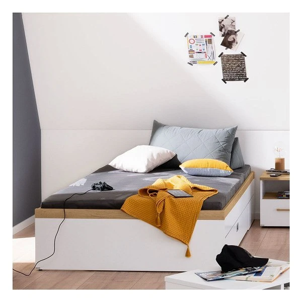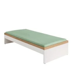 Die Paidi Oscar Studioliege besitzt geschlossene Kopf- und Fußteile. Diese sowie die Bettseiten haben einen umlaufenden Abschluss aus Eiche-Nebraska-Nachbildung. Durch ihre niedrigen Häupter passt sie gut unter Dachschrägen.