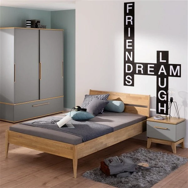 Die Paidi Sten Traumliege macht das Zimmer durch ihren gemütlichen Stil perfekt. Das hohe Kopfteil und die abgeschrägten Bettpfosten lassen das Bett tagsüber zu einem Ort zum relaxen werden.