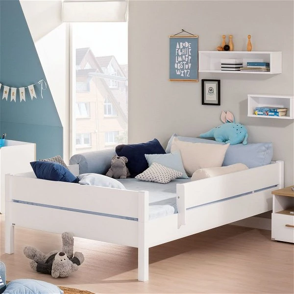 Die Paidi Tiago Liege besitzt offene Kopf- und Fußteile mit gleich hohen Häuptern. Sie kann zum Etagenbett, Spielbett oder Hochbett umgebaut werden und lässt sich mit Bettkästen, einem Ausziehbett, diversen Textilien und Absturzsicherungen ergänzen.