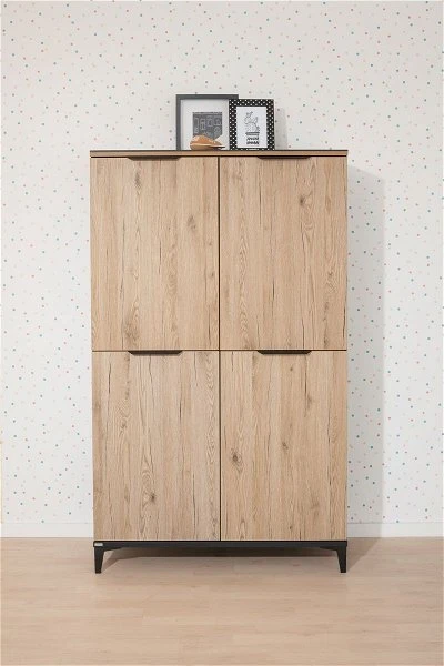 Der naturschwarze Korpus des Paidi Tomke Regal und die Einlegeböden und Türfronten in Eiche-Bordeaux bilden einen tollen Kontrast. Die zweifarbige Deckplatte und die Füße und Griffe aus gebürstetem Metall unterstreichen den industriellen Look. Dieses Regal bietet Ihnen ausreichend Stauraummöglichkeiten – im Kinder- und später auch im Jugendzimmer.