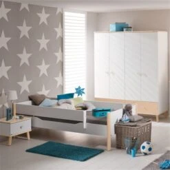 Die Paidi Ylvie Liege besitzt offene Kopf- und Fußteile mit gleich hohen Häuptern. Sie kann zum Etagenbett, Spielbett oder Hochbett umgebaut werden (nur mit Liegefläche 90×200 und 120×200 cm) und lässt sich mit Bettkästen, einem Ausziehbett (siehe Foto), diversen Textilien und Absturzsicherungen ergänzen.
