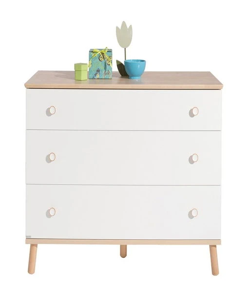 Die Paidi Kommode schmal ist mit 3 Schubkästen ausgestattet. Die Schubkästen können wahlweise in kreideweiß oder Birke-Nachbildung geliefert werden. Der obere Schubkasten ist immer kreideweiß und hat einen Vollauszug. Der im Preis enthaltene Wickelaufsatz bietet eine Wickelfläche von 84,2 x 76,8 cm. In die Schubkästen kann ein Schubkasten-Einsatz eingesetzt werden, dieser wird weiter unten als Variante angeboten.