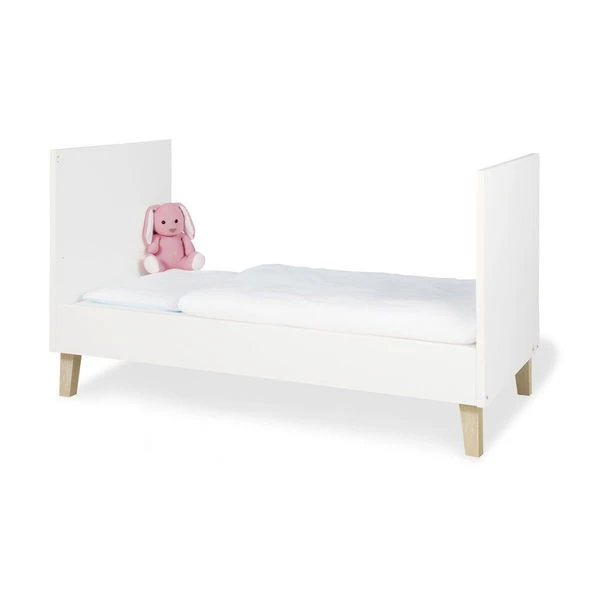 Das Pinolino Lumi Kinderzimmer bietet eine Kombination von klarem Weiß und der Eiche-Echtholzstruktur, so passt es perfekt zu einer modernen Einrichtung. Die hochwertigen Möbelfüße aus massiver Eiche runden das Gesamtbild ab.