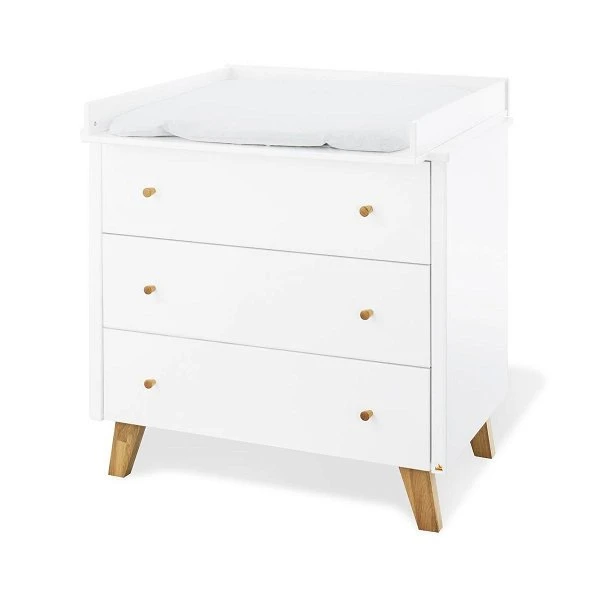 Mit weißen Fronten und Möbelfüßen aus massiver Eiche versprüht die Pinolino Pan Wickelkommode ihren Retro-Charme im Reich Ihrer Kleinen. Ein trendiges Design für moderne Familien.
