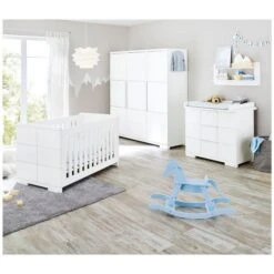 Das Pinolino Polar Kinderzimmer breit groß besteht aus einem Kinderbett, einem dreitürigen Kleiderschrank und einer breiten Wickelkommode.