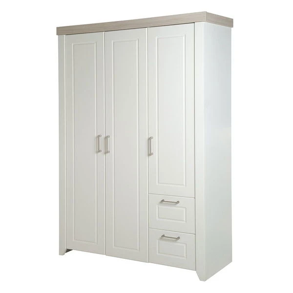 Der Kleiderschrank Felicia ist mit 3 Türen und 2 Schubladen ausgestattet. Innen befindet sich 5 Einlegeböden und 1 Kleiderstange.