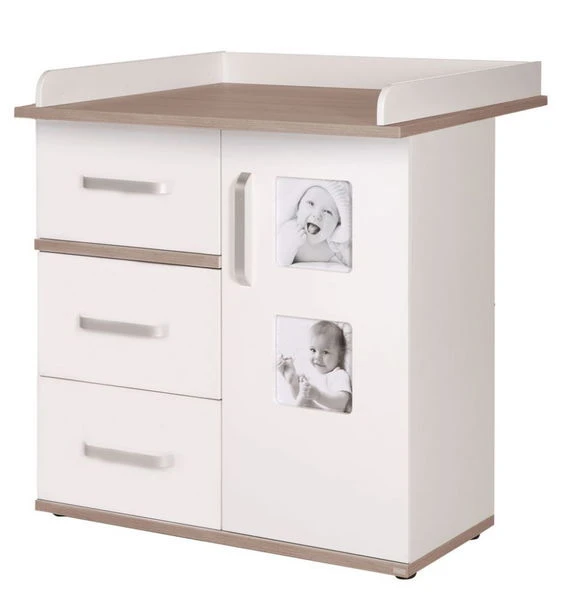 Die Wickelkommode ist mit einem abnehmbaren Wickelansatz ausgestattet. Die 3 Schubladen bieten sehr viel Platz und Stauraum für Windeln und andere Dinge. Der Innenraum hinter der Tür der Kommode ist durch einen Einlegeboden unterteilt. Die integrierten Bilderrahmen können mit persönlichen Fotos bestückt werden und machen die Wickelkommode so zu einem Unikat.
