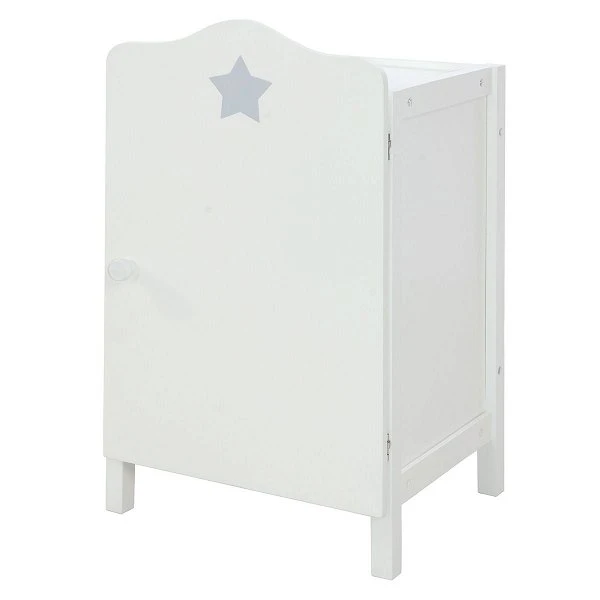 Im Roba Puppenkleiderschrank lassen sich allerhand Puppenkleidung und Puppenzubehör unterbringen. Auf der Tür befindet sich ein Sternenmotiv und im Inneren gibt es eine Kleiderstange und eine Ablage.