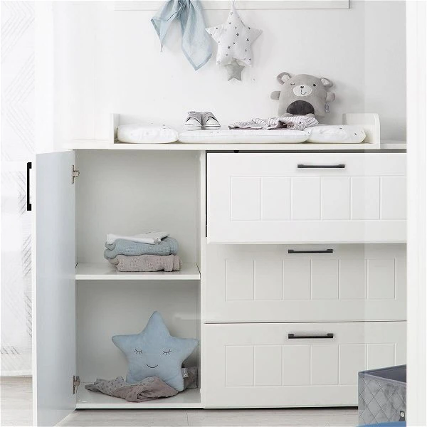 Die roba Sylt Wickelkommode überzeugt mit einem zeitlosen Design und einer aufwendigen Fräsung an den Fronten und hat einen abnehmbaren Wickelaufsatz und eine aufwendig gefräste Front. Die eingebaute Softclose-Technik bei der Tür und den Schubladen sorgt für ein sanftes und leises schließen. Die Wickelkommode kann später als normale Kommode genutzt werden.