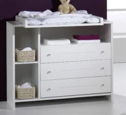 Trendig „natürlich weiß“ präsentiert sich die Wickelkommode ECO Stripe. Die helle Farbauswahl mit dezenter Streifenfräsung der Möbelfronten (MDF) vermitteln Leichtigkeit und ein liebevoll gestaltetes Kinderzimmer. Besonders auffallend und praktisch sind die beiden Seitenregale an der Wickelkommode.