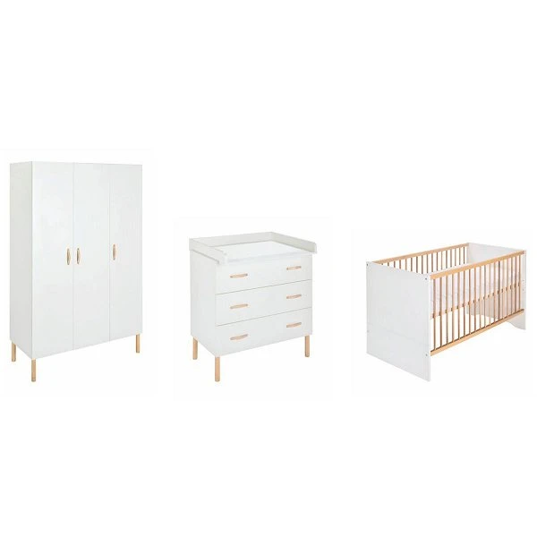 Das Schardt Melody white Kinderzimmer ist im schlichten weiß mit Akzenten in Buche natur. Es ist nicht nur chic sondern auch komplett ausgestattet mit Wickelauflage für die Kommode und Umbauseiten, um das Babybett zu gegebener Zeit in ein Juniorbett umzuwandeln. Ein voll ausgestatteter Kleiderschrank mit Einlegeböden, Soft-Close-System und Kleiderstangen rundet den Lieferumfang ab.