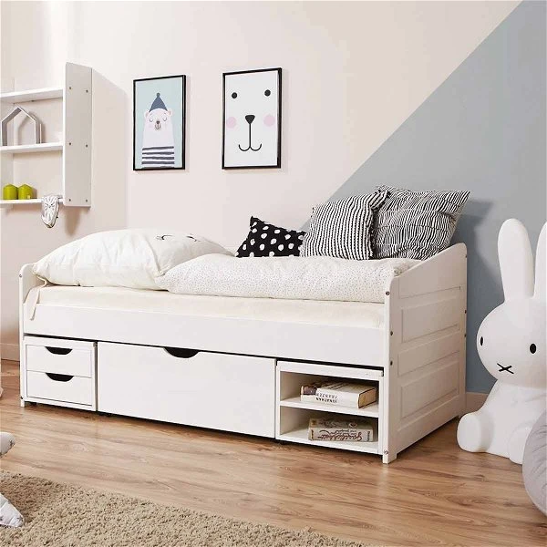 Ticaa Sofabett MINI Micki mit 3er Funktionsschubkasten Kiefer weiß – 80×160 cm
