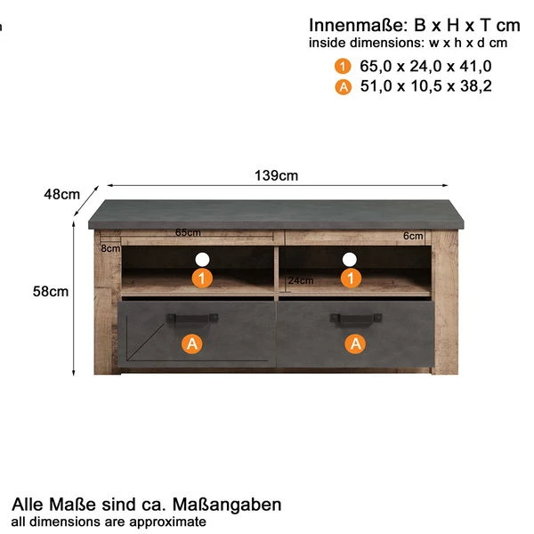 - Maße B/H/T: 139 / 58 / 48 cm