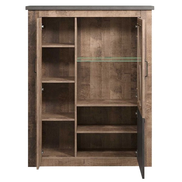 Die trendteam Georgia Vitrine halbhoch ergänzt Ihre Einrichtung um ein stylishes Highlight. Sie sorgt für genügend Stauraum, während sie gleichermaßen nicht zu viel Stellfläche einnimmt. Die Nutzung von Dekorfolie sorgt für eine besonders langlebige Oberfläche. Dank des Korpus im Tabak Eiche und Matera Dekor wird das Design zum absoluten Hingucker, und passt sich ideal dem Raum an. Vervollständigt wird das Dekor durch schwarzfarbene Griffe.