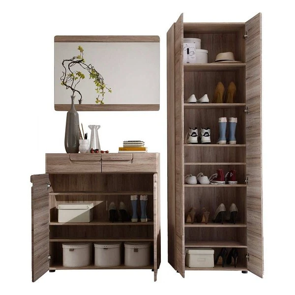 Die Garderobe besteht aus Garderobenschrank, Schuhkommode und Wandspiegel.