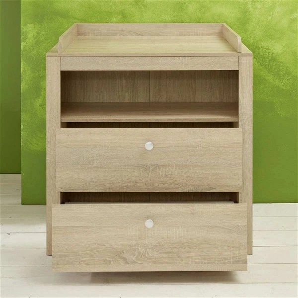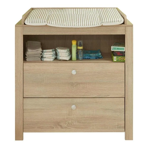 Die trendteam Olivia Wickelkommode verfügt über 1 offenes Fach und 2 Schubkästen diese bieten genügend Stauraum für alle Hygieneartikel. Die Verwendung von Melamin sorgt für eine ausgesprochen robuste Oberfläche. Dank des Korpus im Eiche Sägerau hell Dekor wird das Design zum tollen Hingucker und passt sich hervoragend dem Raum an. Vervollständigt wird das Dekor durch silberfarbene Griffe.