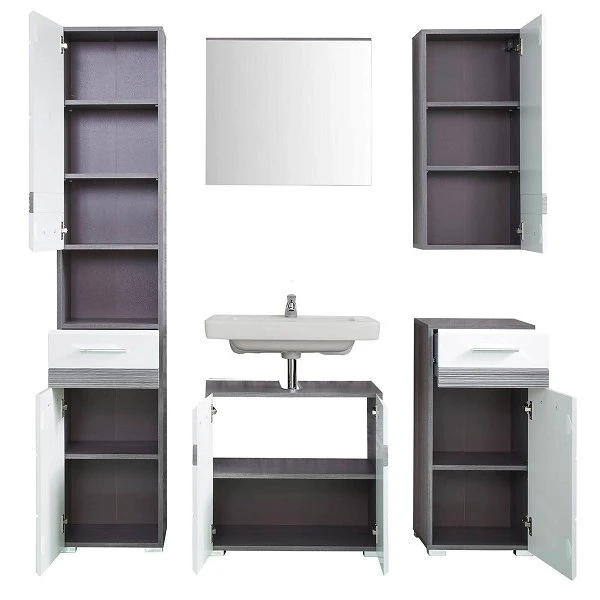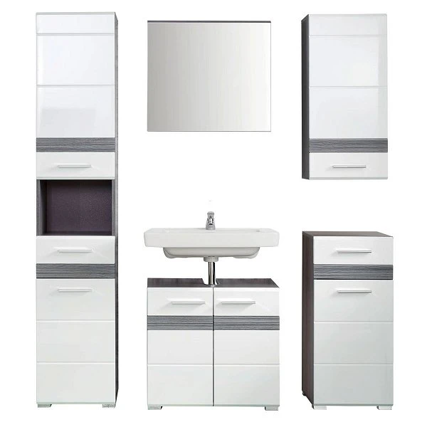 Die nassraumgeeignete trendteam Set-One Bad Kombination punktet nicht nur mit ihrer stylishen Aufmachung, sondern offeriert Ihnen zugleich auch extra Stauraum in Ihrem Badezimmer. Eine einzigartige Beständigkeit wird durch den Einsatz von Dekorfolie sowie Melamin garantiert. Das Design kennzeichnet der rauchsilberfarbene Korpus im Sardegna Dekor in Kombination mit der weißen Front in dekorativer Hochglanz Tiefzieh Optik. Silberfarbene Griffe ordnen sich farblich ideal in das Dekor ein. Der Artikel lässt sich bestens mit zusätzlichen Möbeln des Sets kombinieren.
