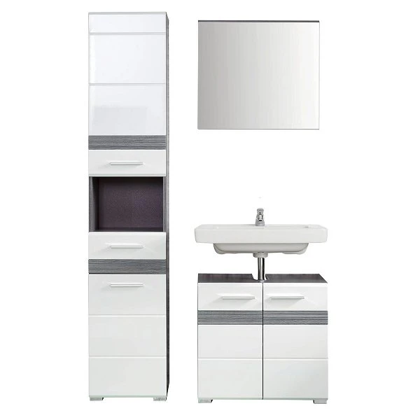 Die nassraumgeeignete trendteam Set-One Bad Kombination punktet nicht nur mit ihrer stylishen Aufmachung, sondern offeriert Ihnen zugleich auch extra Stauraum in Ihrem Badezimmer. Eine einzigartige Beständigkeit wird durch den Einsatz von Dekorfolie sowie Melamin garantiert. Das Design kennzeichnet der rauchsilberfarbene Korpus im Sardegna Dekor in Kombination mit der weißen Front in dekorativer Hochglanz Tiefzieh Optik. Silberfarbene Griffe ordnen sich farblich ideal in das Dekor ein. Der Artikel lässt sich bestens mit zusätzlichen Möbeln des Sets kombinieren.