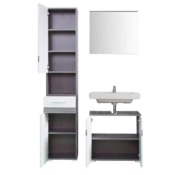 - bestehend aus Waschbeckenunterschrank, Wandspiegel und Hochschrank