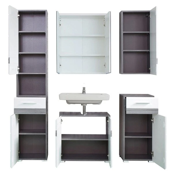 Die nassraumgeeignete trendteam Set-One Bad Kombination punktet nicht nur mit ihrer stylishen Aufmachung, sondern offeriert Ihnen zugleich auch extra Stauraum in Ihrem Badezimmer. Eine einzigartige Beständigkeit wird durch den Einsatz von Dekorfolie sowie Melamin garantiert. Das Design kennzeichnet der rauchsilberfarbene Korpus im Sardegna Dekor in Kombination mit der weißen Front in dekorativer Hochglanz Tiefzieh Optik. Silberfarbene Griffe ordnen sich farblich ideal in das Dekor ein. Der Artikel lässt sich bestens mit zusätzlichen Möbeln des Sets kombinieren.