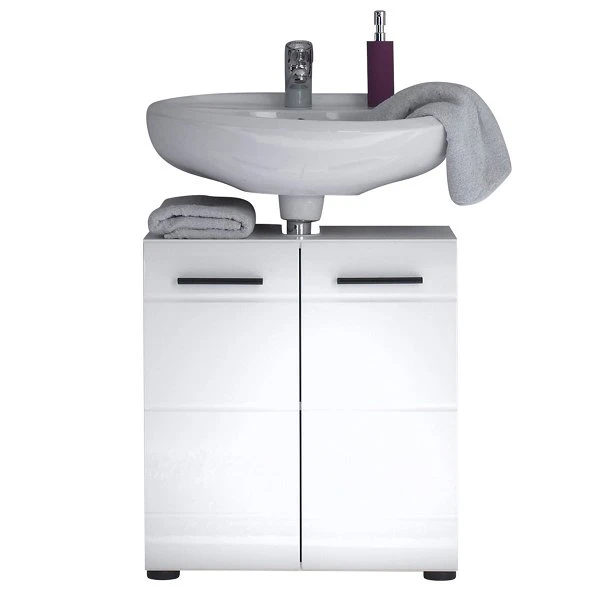 Der trendteam Skin Waschbeckenunterschrank mit einer Front in Weiß Hochgalnz fügt sich ideal in Ihr Badezimmer ein. Die genutzte Dekorfolie verschafft der Oberfläche Robustheit. Dank der weißen Front- und Korpusgestaltung wird das Design zum echten Hingucker, und passt sich ideal dem Raum an. Die farbliche Gestaltung wird durch die schwarzfarbenen Griffe abgerundet.