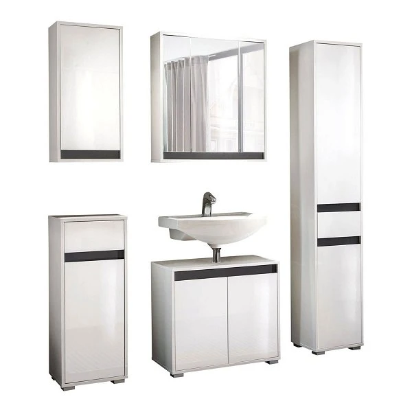 Die trendteam Sol Badmöbel ist eine stylishe Lösung für jedes Badezimmer, in dem es noch an Stauraum fehlt. Der genutzte Lack in Verbindung mit Dekorfolie verschafft der Oberfläche Beständigkeit. Das Design kennzeichnet der weiße Korpus in Kombination mit der Absetzung aus Melamin, wodurch es wunderbar zu deinem weiteren Mobiliar passt.