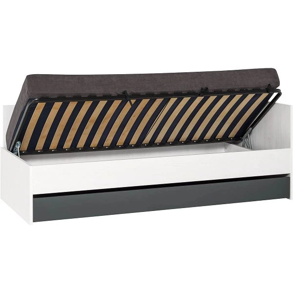 Das Sofabett Nest eignet sich ideal für kleine Zimmer und hat an zwei Seiten einen erhöhten Rand. Unter der Liegefläche befindet sich ein geräumiger Bettkasten über die ganze Breite und Länge des Bettes.